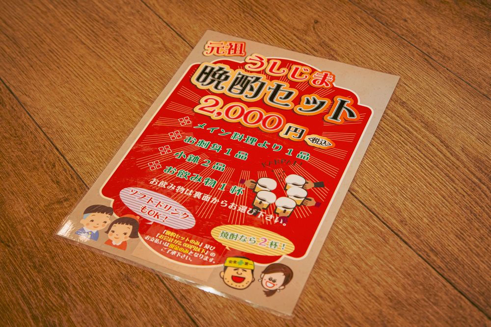 お客さんの9割がまず頼むというのが『晩酌セット』。チキンカツチーズ、豆腐ピザなど6~7種類のメインから1品選び、お刺身1品、小鉢2品、お好きなドリンクが付いて、なんと2000円!ボリューミーと評判のうしじまらしく、一皿一皿は大満足の味と量。「この晩酌セットだけでお腹いっぱい」なんて声も聞こえてくるほどらしい。