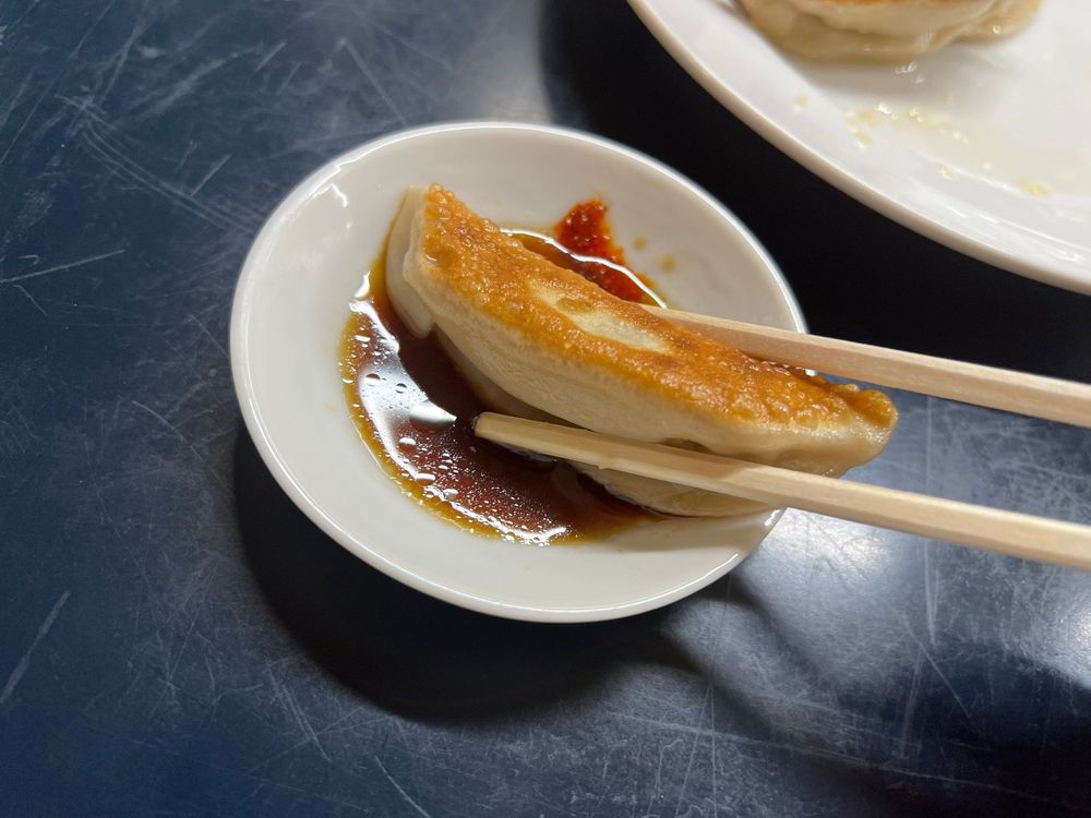 白雅特製の「ラージャン」は、一味唐辛子とごま油をベースにした独自の調味料。一口食べると、ピリッとした辛さが口の中に広がり、その後にごま油の香ばしい風味が追いかけてくる。白石さんは「これがまた辛いんですよ。」と語る。餃子の味わいをさらに引き立てる独自の調味料「ラージャン」だが、少しずつ加減して入れる必要がありそうだ。