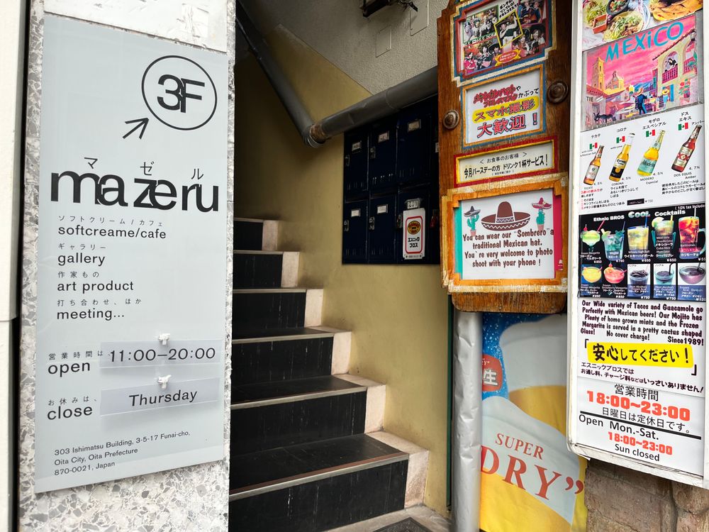 大分市府内町、町の景観に溶け込むビルの3階にモダンなお店がある。 クリエイティブ複合スペース「mazeru」。2022年12月にオープンしたお店で、アート作品の販売・展示のできるギャラリーにカフェスペースが併設されている。