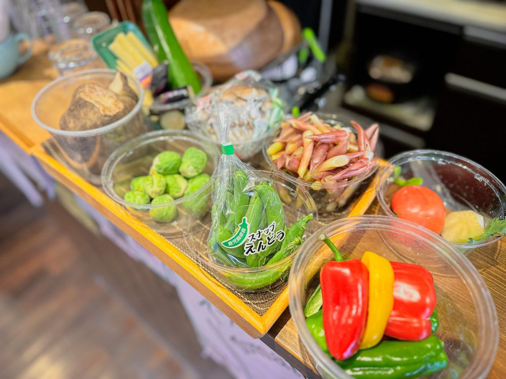 Ash 的咖喱是一种 "无水咖喱",不使用水和油,通过煮沸新鲜番茄制作而成。西红柿产自县内主要产地之一的 Taketa,在加入肉末和其他配料后,经过两个小时的炖煮,盐分达到最佳水平,这样就不会失去西红柿的新鲜口感。然后加入时令蔬菜。加入的蔬菜种类繁多。这一天,盘子里有土豆、黄花菜、球芽甘蓝、莲藕和茄子等蔬菜。